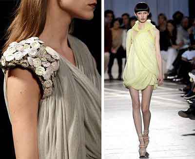 但并非所有的风格都如此强烈,设计师依然通过精细的裸色薄纱在身体上的悬垂裹缠而保持了最温柔的古典主义女性风情,还有那肩头的糖果色饰边。