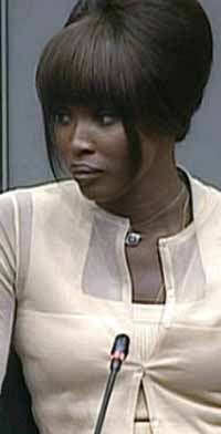 著名黑人超模“ 黑珍珠” 纳奥米·坎贝尔(Naomi Campbell)近来身陷非洲“血钻石”风暴,五日在荷兰海牙联合国“ 狮子山特别法庭”作证,承认1997年9月间她参加一场利比里亚前总统查尔斯·泰勒也也出席的晚宴后,曾收到一份“看上去很丑陋的石头”的礼物。但坎贝尔矢口不提“钻石”字眼,也未说是泰勒本人送的礼物。