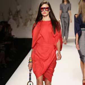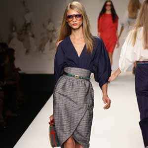 短袖衬衫束在由细绳装饰腰间和流苏边褶的长裙内,这样的设计看起来有点保守,不过,紫色、绿色和白色三种颜色条纹的腰带给 Fendi带来现代、时尚的感觉,而那些丝绸质地的桃红色衣服和多彩的皮草披肩更是让人心情愉悦,每一款都独特而精美。