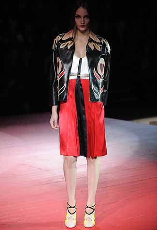 长袖缎面洋装、腰部系上皮质或尼龙材质的细腰带,这一切令人回想起端庄文雅的60年代、极具摇滚魅力的70年代,绣有星星状和荧光色装饰的金色亮银色外套绝对是标志性的穿着,延续着80年代的风采。 Miuccia将这些服装一一呈现在舞台上,让它们不再仅是单纯的文字叙述,更带来时尚和创造性的感官冲击,令人耳目一新。
