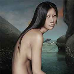这些野外风景来自澳大利亚的极远方,象征着堕落中的伊甸园那未卜的前途。古典艺术里自然中的人是灵感之源 ,这些奇异而陌生的风景唤起往昔和未来的幻影 。文艺复兴时代以人物没有眉毛为美,而将图像修整得平滑光润是好莱坞海报或 Facebook 照片的柔化质感。我将这些年轻模特置于既非过去又非将来的空间中,所以如果她们穿着衣服,将损害我所希望营造的非时间感。这些裸体显得慎重而“深藏”,将对裸体的注意力转至作为故事的图像本身。我感到在裸体人物与其环境之间有着近乎原始的联系。我对用标本剥制术保存一只动物或鸟的全部美好(即使在它们死后)感到着迷。我请模特们摆出动物或鸟儿标本的姿态,在这种情境中,我们看到他们凝结在时间之中,永恒而美好,被保藏在他们自己的世界。