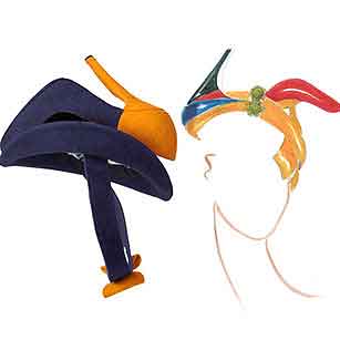 尽管这两位大师已经是 30 多年的朋友,但是直到现在,他们还没有一起合作过艺术项目。斯黛芬-琼斯将 Manolo Blahnik的Pump系列的一副设计草图变为现实,不过这次创作的高跟鞋并非穿在脚下,而是戴在头上的鞋跟上翘的蓝黄色帽子。这让人联想起由Elsa Shiaparelli和Salvadore Dali在1937年设计的超现实主义帽子。高跟鞋帽拥有礼貌整齐的剪裁线形,搭配一个独特的黄色蝴蝶结带,衬里是由 Liberty的印花丝绸做的。这个独一无二的顶上饰品杰作也为两位大师各自的创作舞台上再次创下精彩的一页。