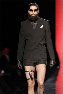 接在 LV 拘谨神秘的 Amish style 后登场的,是鬼才设计师高第耶的视觉震撼,随著耳熟能详的「007」电影音乐响起 ,高第耶让男模化为詹姆斯庞德,一个个配枪、拿匕首上场,只是颠覆银幕硬汉形象,穿上短裤网袜、裙子、金色围巾或外套、蒙面飞行员,或是紧身燕尾服,高第耶让男人也妖娆优雅。