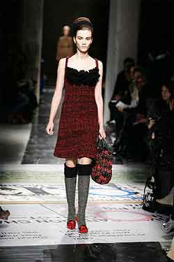 PRADA 运用双面羊毛与缎质丝织品,结合格子呢绒与粗针织;再以珠饰与双色调格子呢绒设计晚装系列,演绎1950年代上流社会的穿著品味。整体色调以深色为主,如黑色、墨绿色、酒红色,其中以红色、绿松石蓝及紫色等明亮色彩点缀,创造不同现代感。