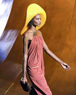Marc Jacobs 春夏相当70年代,各种颜色的宽边草帽配上絃丽色彩的服装和妆容,带有浓厚的戏剧感。而帽子的戴法也很特别,将大范围的帽子往后摺,露出脸部的同时也能享有帽子的造型感。