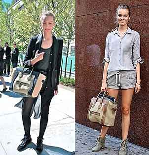 这个夏天可谓是一个青春活力的夏天 。 除了一贯走有型距离感路线的潮人们纷纷背起复古风格的剑桥小书包 ,重温青涩的学生时代之外 ; 几乎随处可见的 ,入镜率极高的赛琳笑脸包 ,即囧包( CÉLINE Luggage Collection: Boston Tote )也横扫了整个夏天,成为了当之无愧的新晋IT手包,为一众平时面若冰霜的明星和时装精们增添了几许亲和可爱的气质。