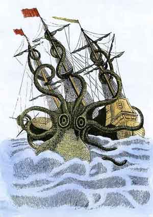 英国「每日邮报」(Daily Mail)报导,麻州霍利 奥克山学院(Mount Holyoke College)古生物学教授 麦曼纳米(Mark McMenamin)说,从海中动物遗骸上的 痕迹,他发现可以证明一个古代、像公交车大小的章鱼种 (像神话中Kraken海怪)跟这些海洋动物的死亡有关。
