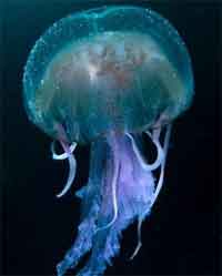 在水中拍摄水母,是一场冒险,因为水母是一种比眼镜蛇还危险的生物。水母的触手上布满刺细胞,像粘在触手上的一颗颗小豆。这种刺细胞能射出有毒的丝,当遇到“敌人”或猎物时,就会射出毒丝,把“敌人”吓跑或将其毒死。几年前,美国《世界野生生物》杂志综合各国学者的意见,列举了全球最毒的10种动物,名列榜首的是生活在海洋中的箱水母。一个成年的箱水母,触须上有几十亿个毒囊和毒针,足够用来杀死20个人。紫水母的威力也不容小觑,2007年,英国北爱尔兰一座鲑鱼养殖场,10万条鲑鱼遭紫水母攻击后死亡。