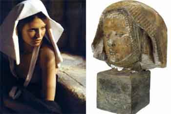 模特比安卡·巴尔缇 (BrancaBalti)身着香奈儿2010年春夏高级成衣的头巾造型,和一件15、16世纪之交的石灰石雕塑头像《 伯纳丁 》摆放在一起,陈列的方式显然在暗示他们之间存在着某种关联。这件中古头像来自法国科雷兹省,是拉本茨艺术与历史博物馆的藏品,这样我们就明白了关联到底在哪里:科雷兹省有一座奥巴辛修道院(Aubazine),那里收藏了香奈儿成为香奈儿之前的过去。