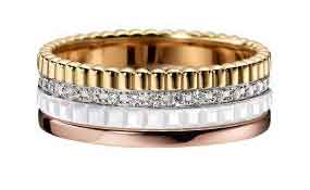 另外,法国珠宝品牌 BOUCHERON 经典的 QUATRE 四色金系列,简单优雅的一体设计却融合18K黄金、白金 、玫瑰金及品牌独家的巧克力金四种材质 ,展露不同的质感和光采 ,QUATRE 白巧克力系列、 QUATRE FOLLIES 系列或 My First QUATRE 系列则都在经典中,注入白陶瓷、单颗美钻、精钢等新元素。