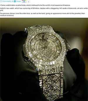 据英国《 每日邮报 》3月8日报道,瑞士一家钟表商日前造出世界上最昂贵的手表,它上面镶嵌1292颗钻石,售价500万美元(约合3153万元人民币)。