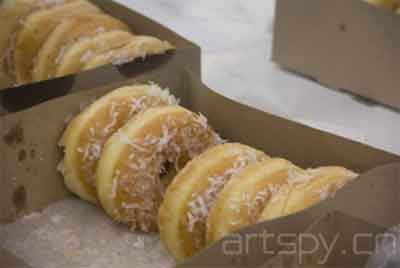 上个星期,洛杉矶For Your Art(艺术机构名)集合了来自整座城市中出售甜甜圈的品牌店,为洛杉矶市民提供了一次长达24小时的“ 流动式” 甜甜圈赠送服务。它与正在街对面洛杉矶市立美术馆 ( Los Angeles County Museum of Art,简称 LACMA ) 中展出的克里斯蒂安·马克雷 ( Christian Marclay)的著名作品“The Clock”同步进行。据For Your Art在Twitter上发布的信息来看,他们在这24小时内为观众免费提供了2700个甜甜圈。