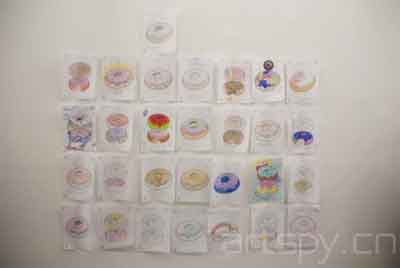 在等待甜甜圈期间,一些摆有蜡笔和未上色甜甜圈的图片的桌子可以让观众自行“设计”他们梦想中的甜甜圈。有的人为它们加上了糖屑,而有的人则为其涂上大量的颜色,充分地享受使用蜡笔的乐趣。整场活动有一种儿童派对的感觉在里面:临时的装饰品、色彩鲜艳的气球等等。它将每个人带回到了自己的童年时代。作为对洛杉矶的一次温馨的介绍,这场活动没有让人失望。不过,我的确没能将它和克里斯蒂安·马克雷(Christian Marclay)的作品联系在一起,除了对时间的关注以外(比如说,什么时候出新口味的甜甜圈?)我也怀疑是否有人将其与“The Clock”对接起来,除了发现自己不断地在这条街两边的艺术空间中闲逛之外——不过这至少也算是某种东西吧。