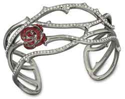 另有取材「睡美人」的 Heart Chain链坠和耳环,以金属荆棘包着紫红色水晶爱心,点缀钥匙与锁头,象征被俘虏的心;Thorn & Roses手镯则令人想起爬满睡美人城堡的藤蔓。