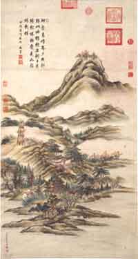 《石渠宝笈续编》收录的董邦达《西湖十景》轴亦为进御之作,系应乾隆在康雍朝基础上继续扩大圆明园规模之需所制,圆明园最著名的四十景中,即有仿西湖十景之景,如“平湖秋月”、“两峰插云”等。正因为有兼用为“ 设计稿”的考虑,董邦达此套作品的规制异常大,每幅的尺寸竟达127×66cm之巨,当是西湖十景题材作品尺幅之最;乾隆似乎也独对此套作品别有钟爱,不仅装裱形制与一般作品不同,更于每幅上亲题七言律诗一首,再加钤其宝玺七枚,显示了极为隆重的“天恩”。值得特别注意的是,据著名中国古代书画专家朱绍良先生等人的考证,目前所见乾隆题诗,九成以上为乾隆朝词臣张照等人代笔,出其亲笔的极为少见;而董邦达此套西湖十景作品上题诗均为乾隆亲题,万不一见。