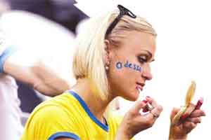乌克兰美女欧洲杯赛场补妆吸引眼球。