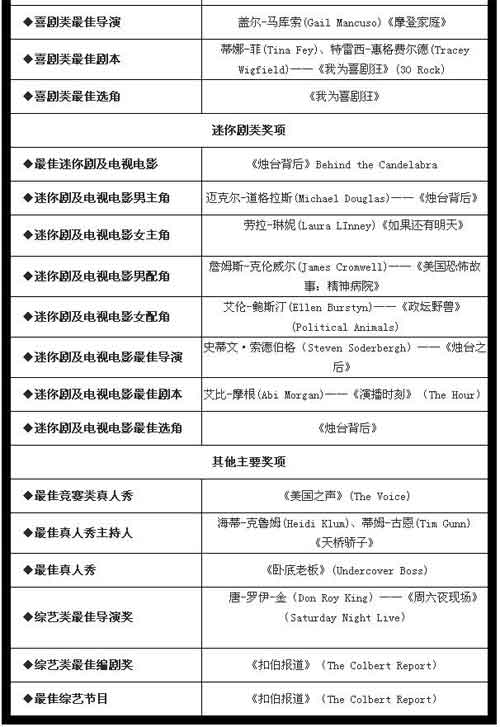 在提名名单中备受关注和看好的《绝命毒师》惨遭滑铁卢,仅仅获得了最佳剧集和女配角两个奖项;相比而言第一次入围就获的剧集类最佳男主角的“ 新闻主播 ” 杰夫-丹尼尔斯(Jeff Daniels)《 新闻编辑室 》就幸运的多了。而当晚最幸运的要数中国观众最喜欢的谢耳朵,他凭借在新一季的《生活大爆炸》中的表现第三次获得了喜剧类的最佳男主角,激动的谢耳朵在舞台上直言感谢男友。